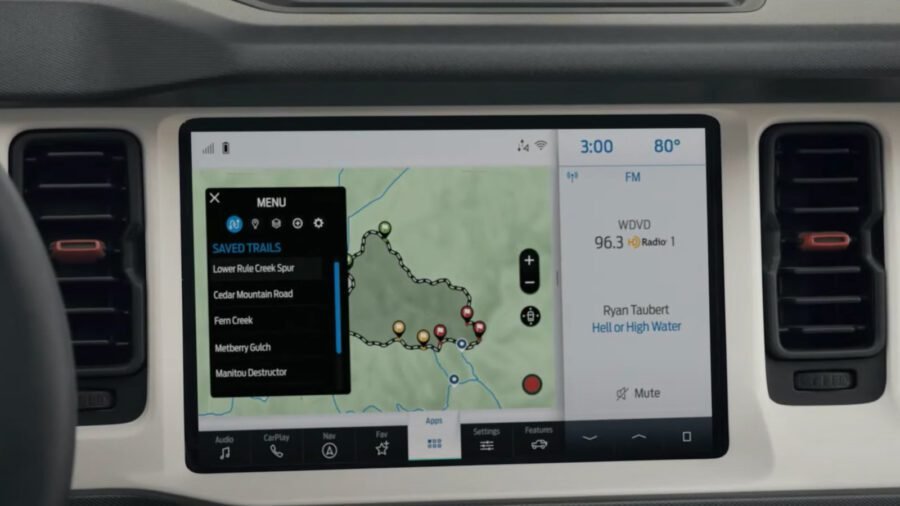 Per fondere al meglio l’hi-tech col fuoristrada, il navigatore del sistema d’infotainment da 12″ del Ford Bronco include oltre 1000 mappe per il fuoristrada (al momento disponibili solo negli Stati Uniti, ma non è escluso che tale opzione possa riguardare anche l’Europa e l’Italia in un secondo istante). Per accedere alle mappe dei percorsi non è necessaria una connessione ad Internet, il che le rende consultabili anche nelle zone più remote e distanti dalle città.